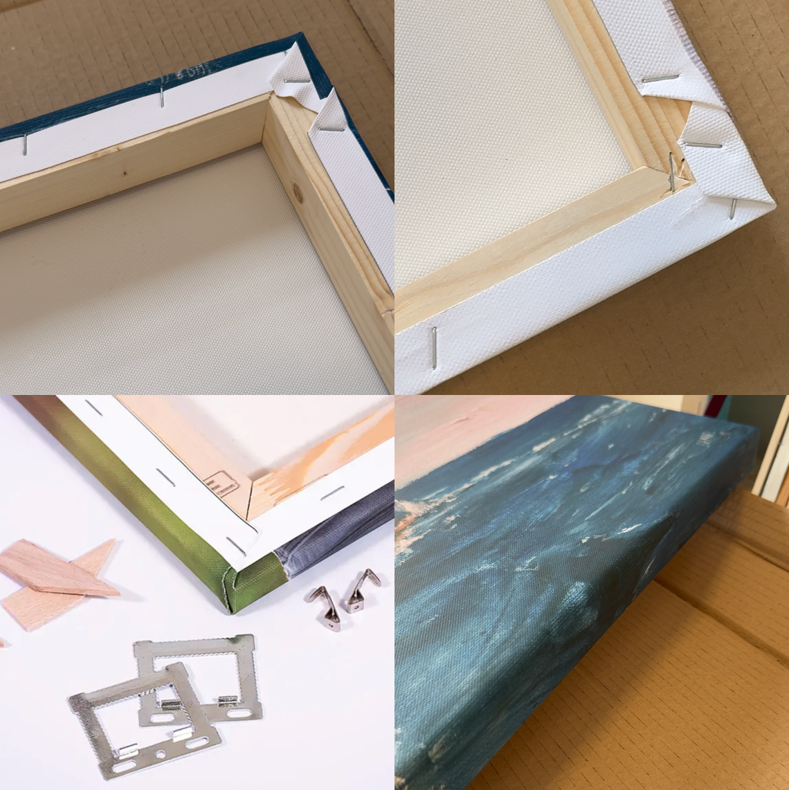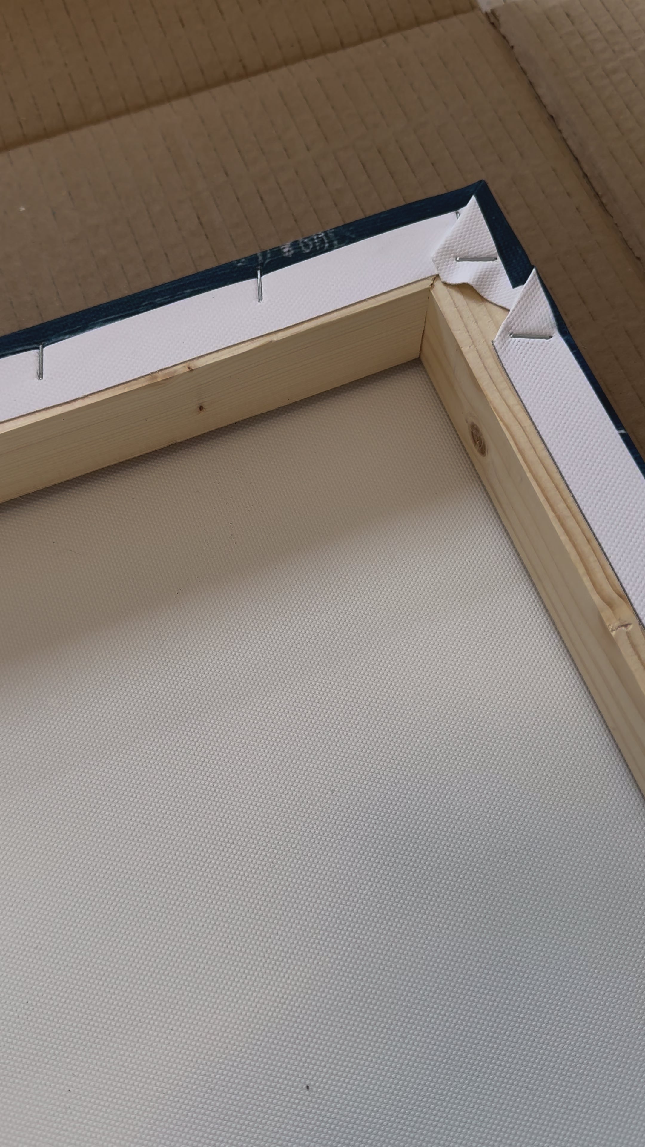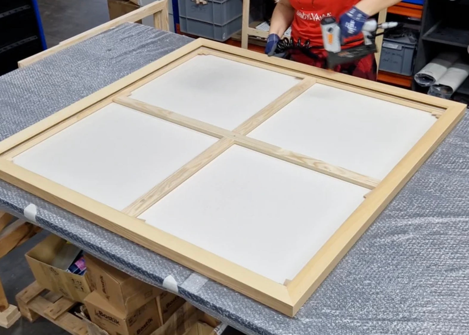 Hereafter my team in the print production is stretching the canvas print on wooden frame on the back.