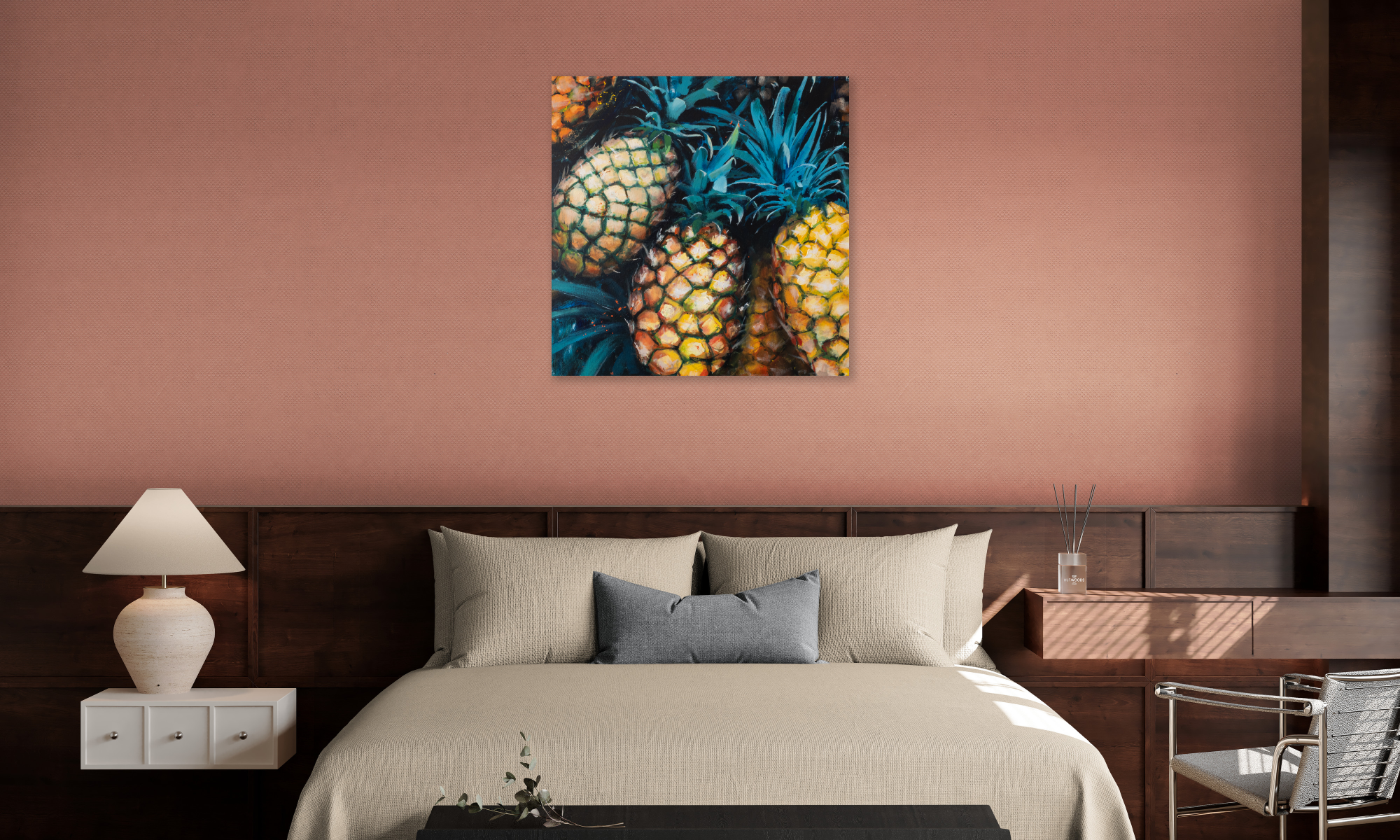 The depth and dimension of this creation emerge through the interplay of shadows, masterfully cast amid the clustered pineapples. I reveled in the artistic process of evoking the almost rhomboid patterns of their rugged skins and unleashing strokes upon verdant leaves.